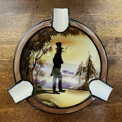 米国輸出用に作られたオールドノリタケの灰皿で 絵柄はすべてハンドペイントです 黒の縁取りや煙草を吸う男性をシルエットで描いているあたりは いかにもアールデコ 男性が単独でモチーフになっているのは珍しいかもしれません