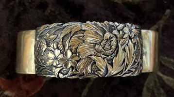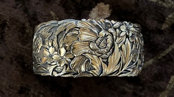 大胆に菊をデザインした戦前の根掛です 非常に状態が良く 金メッキもしっかりと残っています 短髪の私には無用の長物なのですが 細工があまりにも素晴らしくて購入してしまいました 実は この品を購入したのは30年近く昔のこと 当時 戦前の金工は中古品の扱いで 有名作家の品でない限り 驚くほど安値で市場に出回っていました
