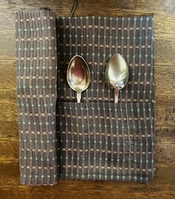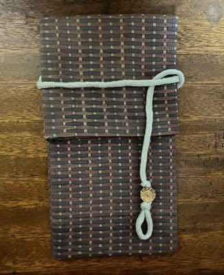 淡い青紫と赤紫・ベージュで格子紋様を描いた和更紗で拵えたカトラリーケースと専用の袋です
