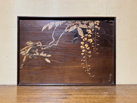 桑の木でできた藤模様の角盆で オリジナルの箱入りで出てきたものです