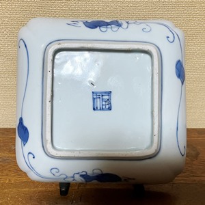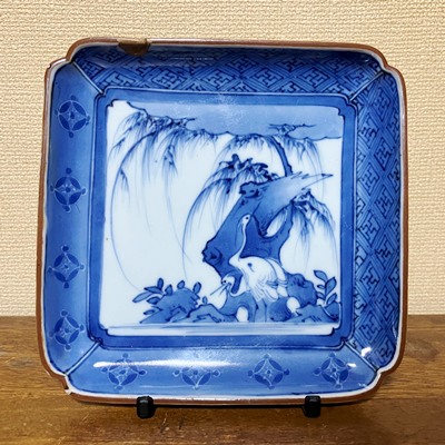 江戸時代前期に作られた12cm四方の平向付です 濃みの濃淡を使い分けて周囲に卍繋ぎ・七宝を描き 中央に柳の下にたたずむ白鷺を描いています 左上に金直しが一カ所ありますが それすらも味わいにしてしまう懐の深さ 濃みの色合いも申し分ありません