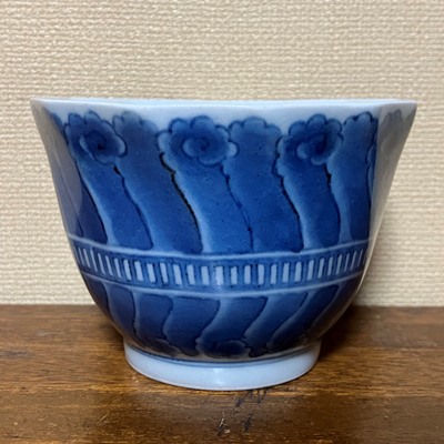 ちょっと不思議な紋様の向付で 江戸時代中期に作られた品です 雲紋かとは思いましたが断定はできないので ご存じの方が炒らしたらご教授ください 紋様の謎はさておき 呉須の発色も美しく 捻りが加えられた造形も見事です